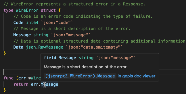 Gopls’ Hover and Definition operations now treat these links just like identifiers, so hovering over one will display information about the symbol:
