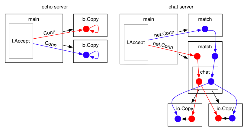 func chat(a, b io.ReadWriteCloser) { fmt.Fprintln(a, "Found one! Say hi.") fmt.Fprintln(b, "Found one! Say hi.") go io.Copy(a, b) io.Copy(b, a) }